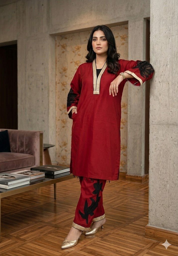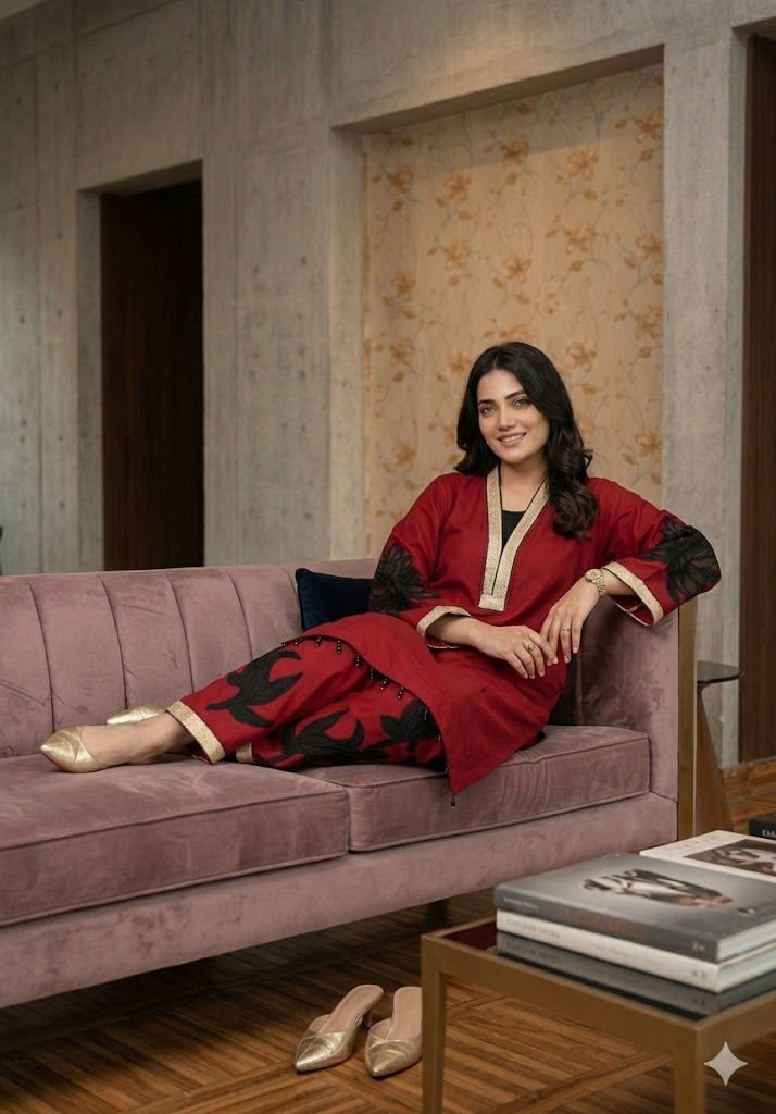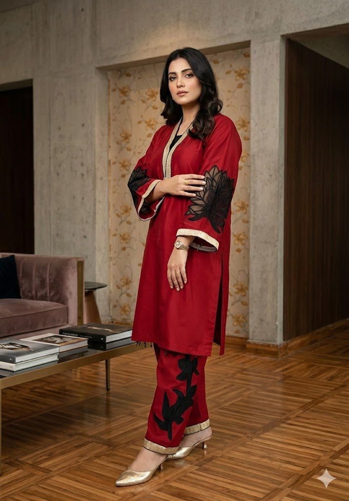 The Trousers: Matching straight-loose lawn trousers designed for comfort and style. The lower leg features a vertical black vine appliqué that mirrors the sleeve design, finished with a coordinating gold border at the hem for a cohesive, high-end look.